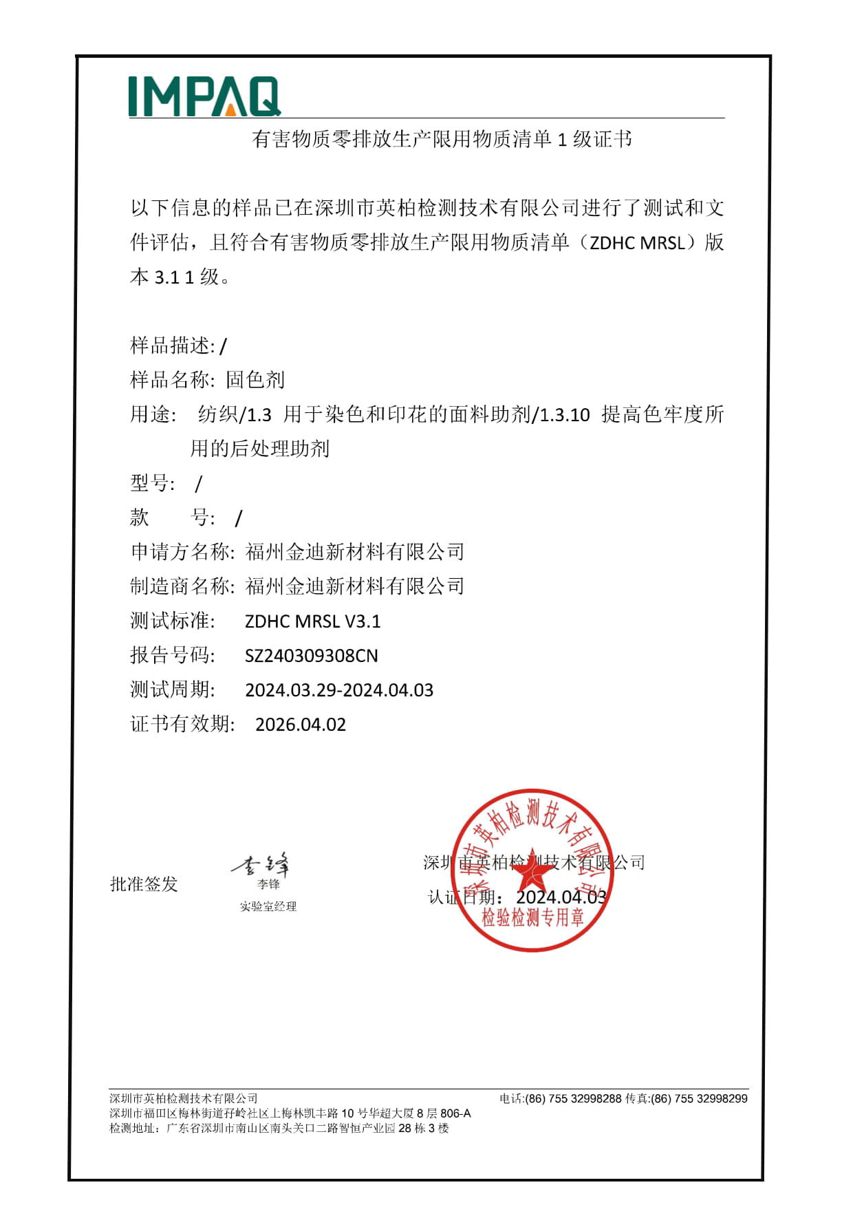 固色剂证书及检测报告
